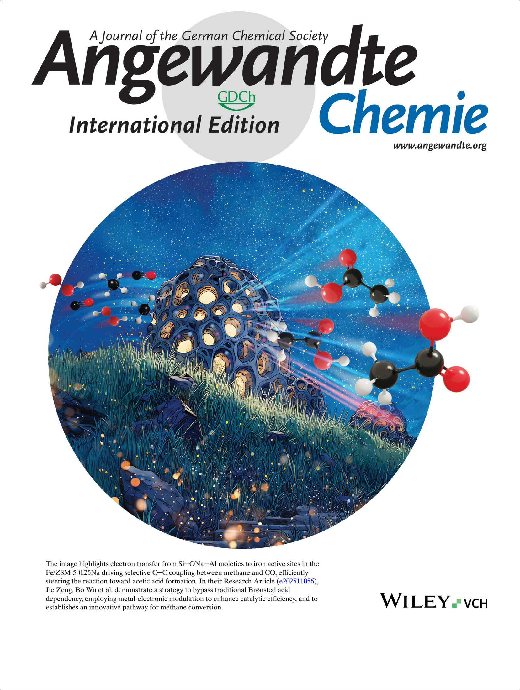 The cover image highlights electron transfer from Si–ONa–Al moieties to iron active sites in the Fe/ZSM-5-0.25Na drives selective C–C coupling between methane and CO, efficiently steering the reaction toward acetic acid formation. In their Research Article, authors demonstrate a strategy bypasses traditional Brønsted acid dependency, employs metal-electronic modulation to enhance catalytic efficiency, and establishes an innovative pathway for methane conversion. |